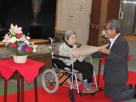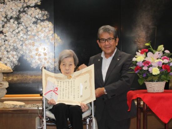 はじめは少し緊張されたご様子でしたが、市長より祝状を受け取られると、晴れやかな笑顔を見せてくださいました。